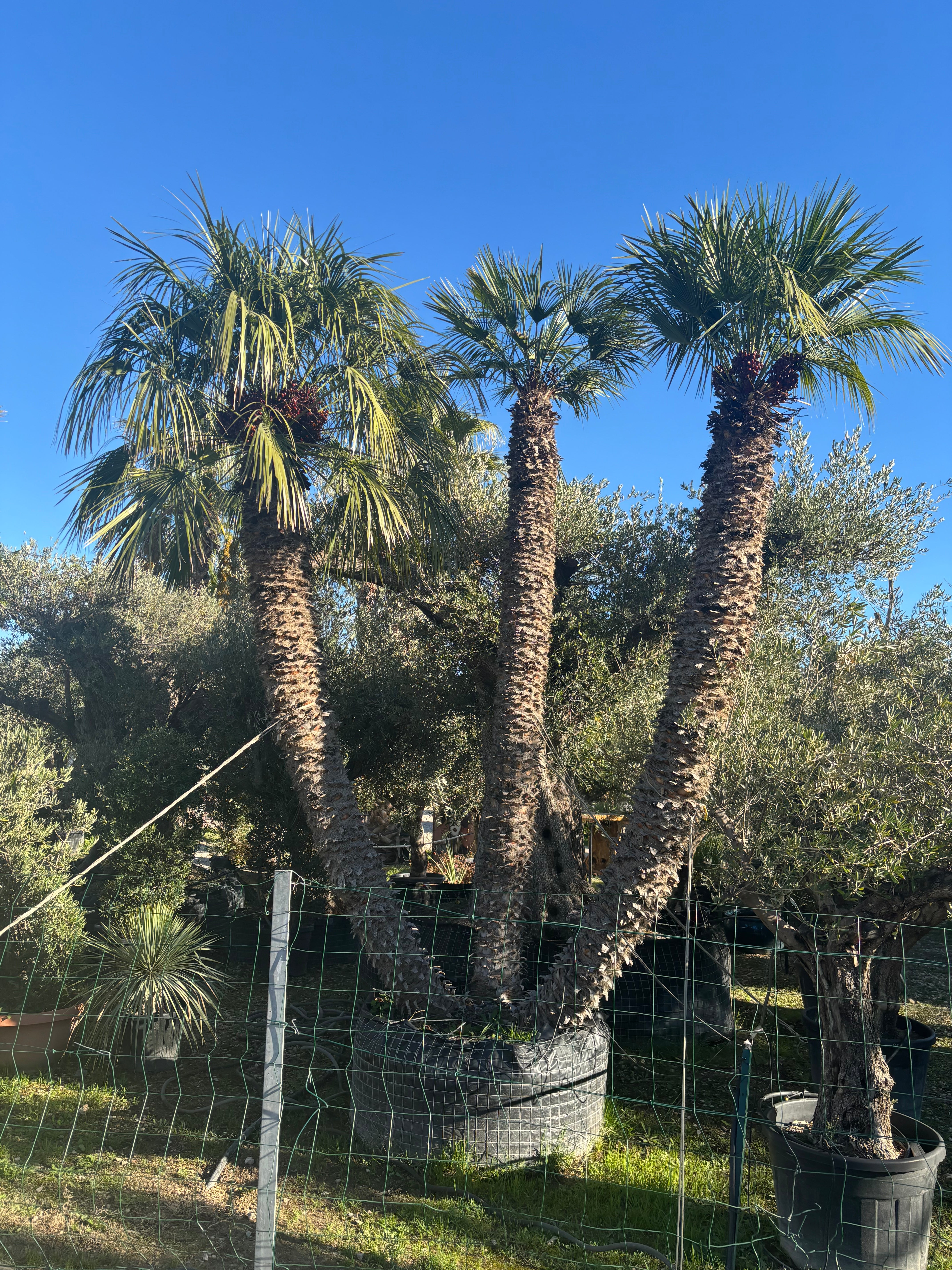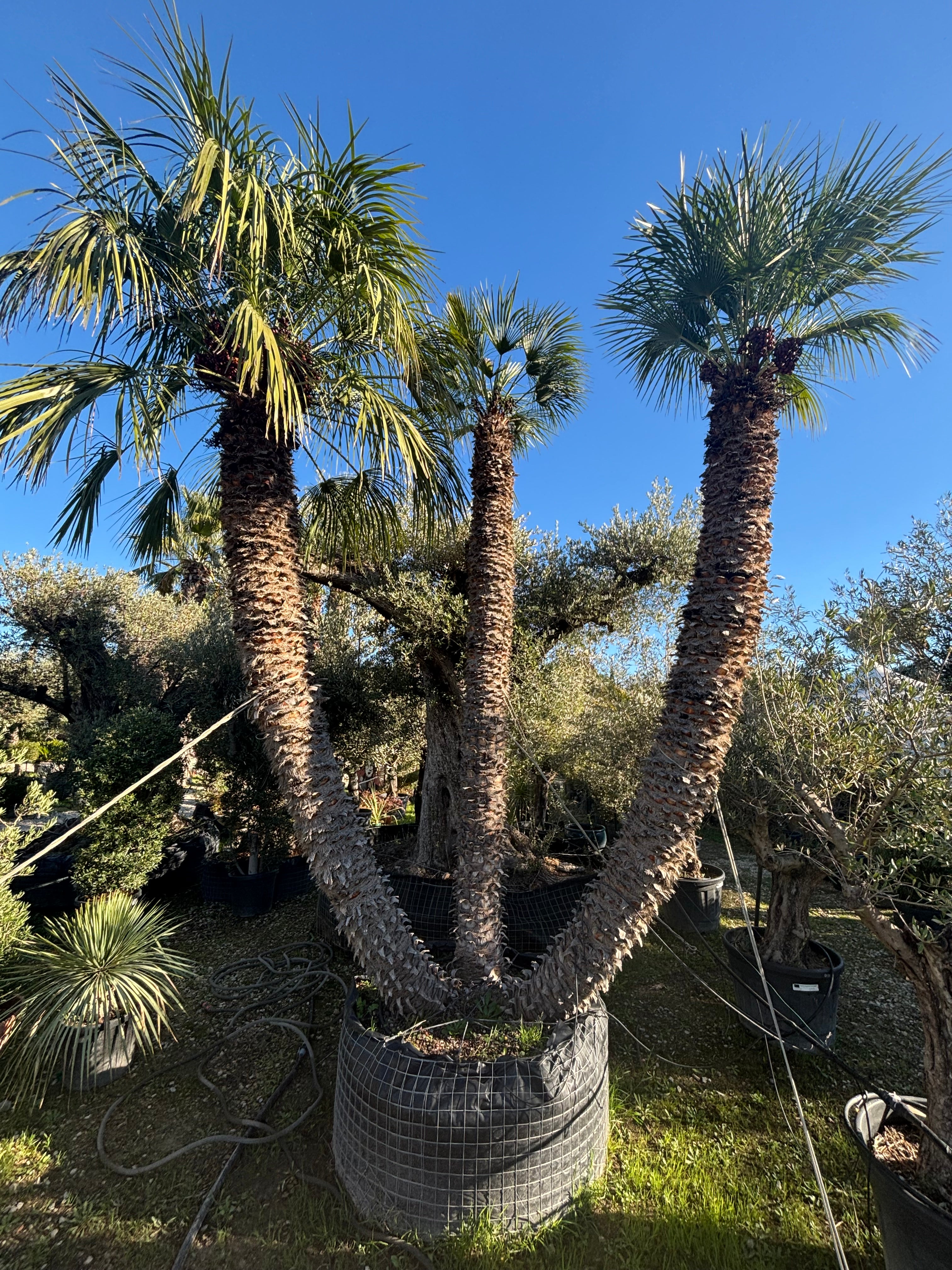 Pièce unique et absolument exceptionnelle, ce Chamaerops humilis multicentenaire triple tronc représente l’essence même du jardin méditerranéen haut de gamme. Formé naturellement par le temps, ses troncs sculptés par les années racontent une histoire vivante, chargée de caractère.