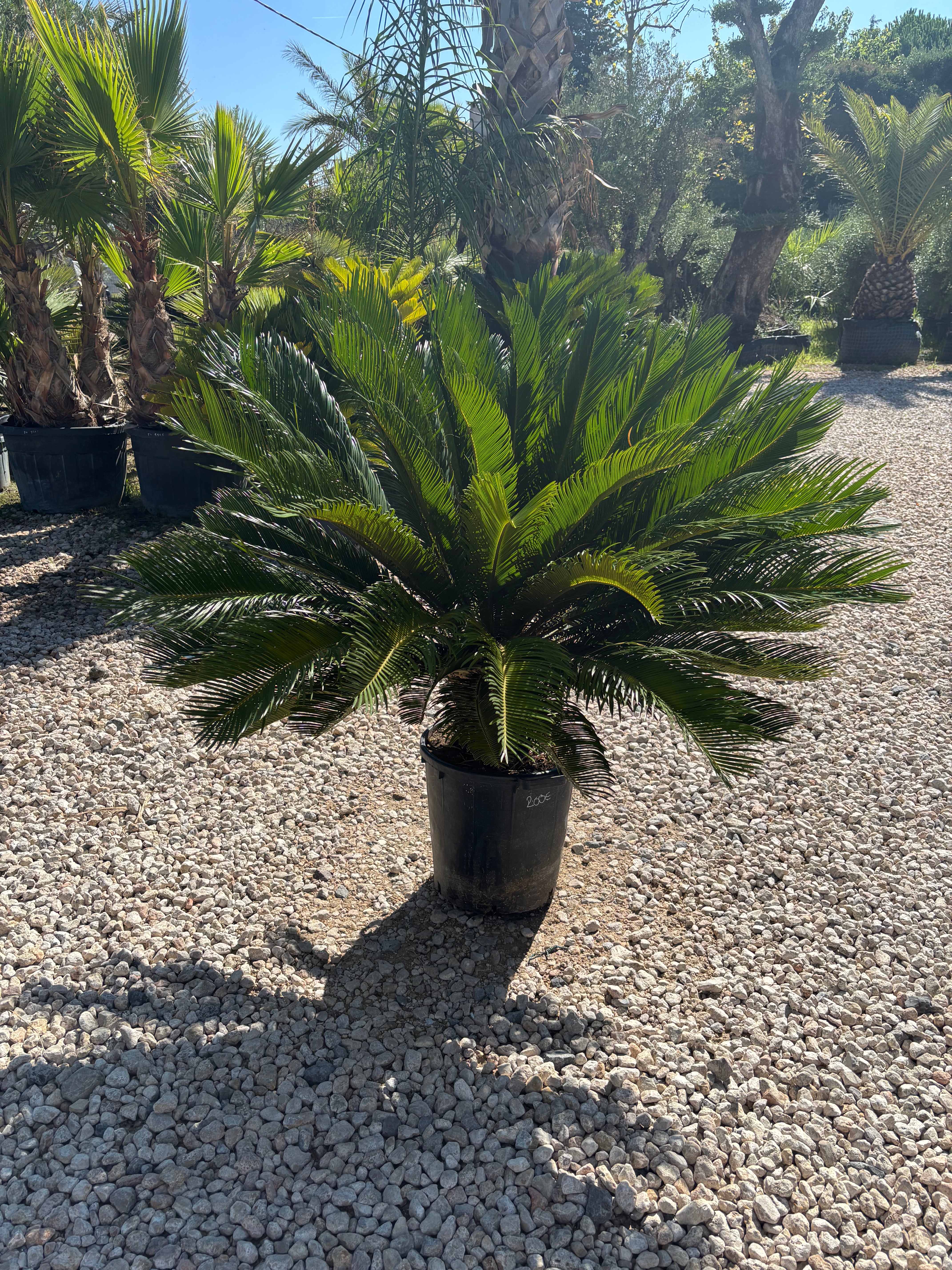 Le Cycas Revoluta, surnommé Palmier sacré du Japon, est une plante ornementale d’une élégance unique. Véritable fossile vivant, il appartient à une famille végétale qui existe depuis plus de 200 millions d’années. Son tronc épais et trapu supporte une magnifique couronne de longues feuilles vert foncé, brillantes et persistantes, qui lui donnent un port majestueux et graphique.