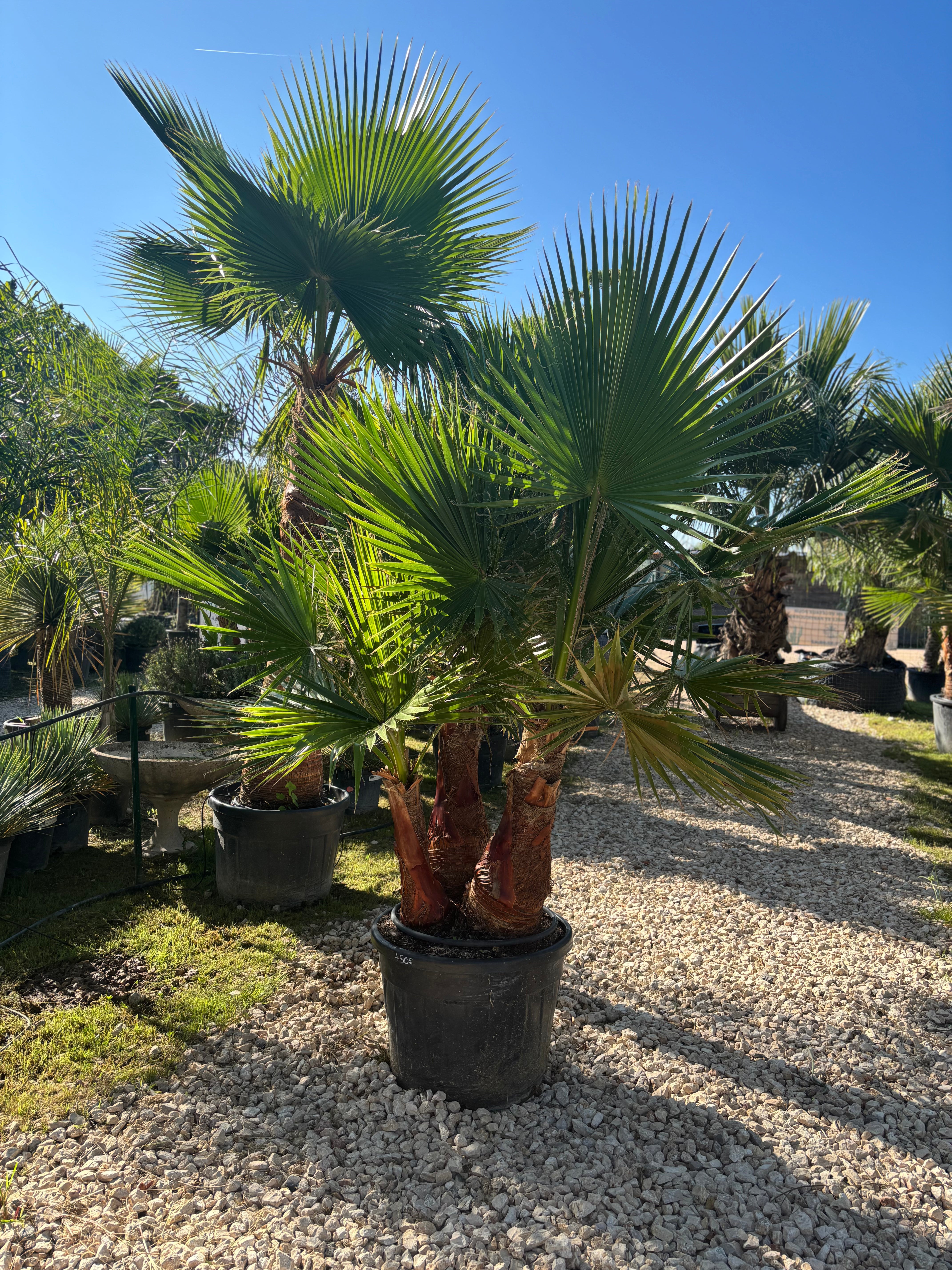 Le Washingtonia robusta est connu pour sa croissance rapide. Ces sujets triple tronc évolueront vite, formant des palmiers majestueux capables de structurer un jardin ou une terrasse. C’est un choix idéal pour obtenir un effet tropical spectaculaire en peu de temps.
